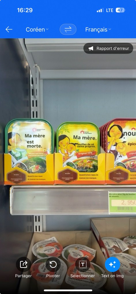 Ensuite j’ai pris le bus pour aller au e-Mart près de la station Jungdong. J’aurais pu y passer des heures à essayer de déchiffrer les étiquettes. Une autre traduction malheureuse de Papago où une boite de pickles d’onions s’est transformée en « ma mère est morte », confusion sur le nom de la marque. J’ai été tenté par des haricots verts dans une sauce rouge – comme me l’a dit mon professeur de coréen, quand c’est rouge, c’est piquant. Je confirme, je n’ai pas pu les manger.