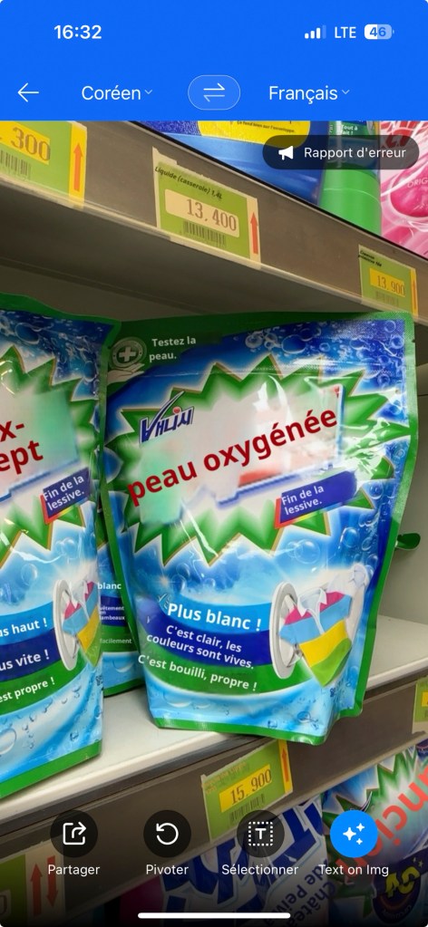 J’ai acheté les choses plus lourdes (jus d’orange…) au supermarché GS25 du coin, notamment de la lessive. Heureusement, j’ai trouvé la marque Persil, du coup j’étais sûre que c’était de la lessive. Dans le passé j’avais acheté de l’assouplisseur. Je dois dire que les traductions de Papago en français sont bien humoristiques. La lessive Oxyclean (옥싴린) c’est transformé en « peau oxygénée ».