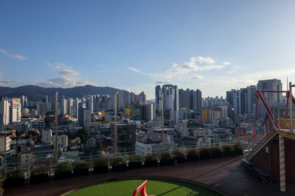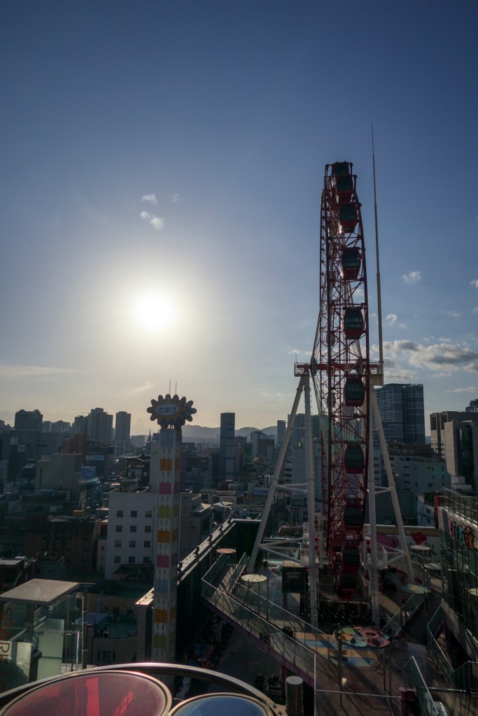 Moment surréaliste au Sparkland, parc d’attraction perché sur le toit d’un immeuble en plein cœur de Daegu. Quasi désert en cette fin d’après-midi, il dégageait une mélancolie étrange – j’imagine qu’il prend vie à la nuit tombée.