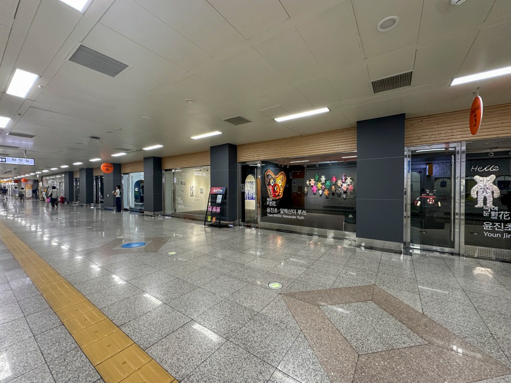 A fascinating discovery: in the underground passage connecting the subway near the Daegu Grand Hotel, the city council has set up galleries to showcase artists. At 7 p.m., the artists give presentations—I act as an extra given my level of Korean! But I watch the passersby, especially those walking on the pebble path laid out in the middle of the gallery. Subway – art – healthy walk: what a trio.
