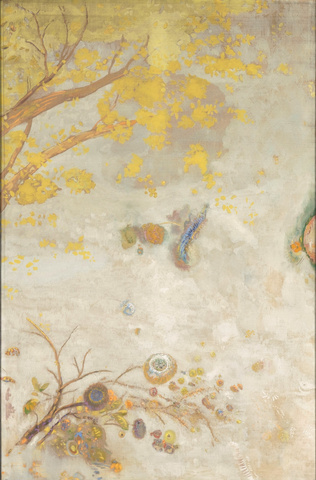 Je n’ai pas trouvé de parapluie, plutôt des ombrelles. Autant il y avait un petit attroupement devant La femme à l’ombrelle de Claude Monet – rien de comparable cependant avec La nuit étoilée de Van Gogh, autant la salle du Signac était pratiquement vide. Pas grand monde non plus devant les Gauguin et encore moins dans la salle suivante consacrée à Odilon Redon dont les arbres sur fond jaune m’ont fascinée.