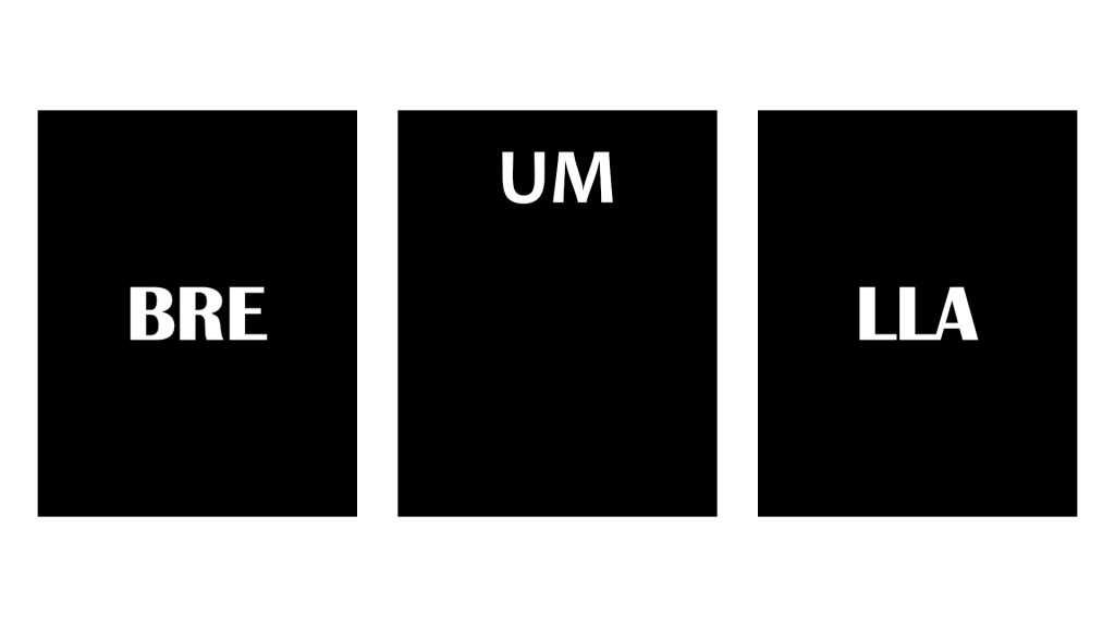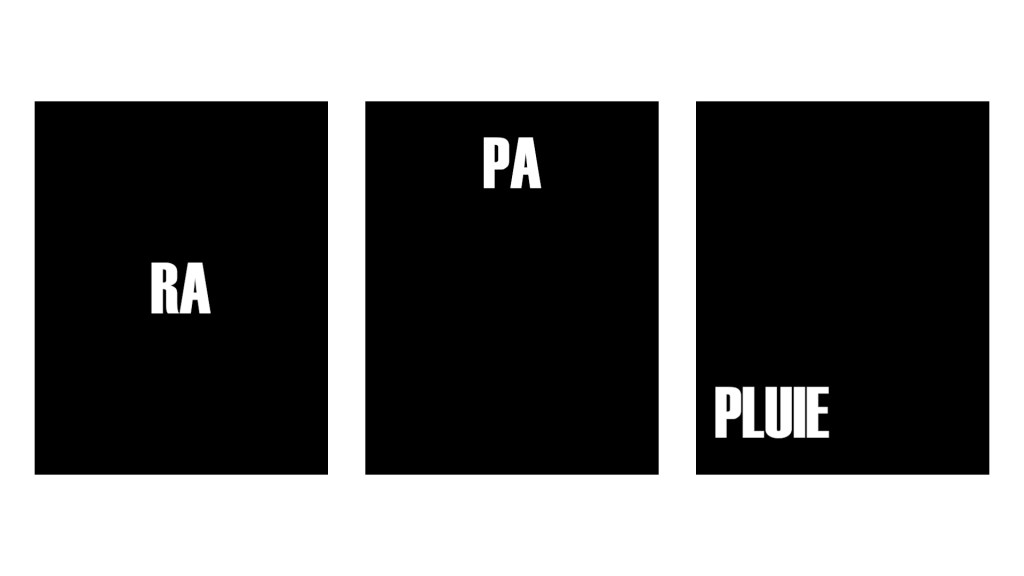 • A second sequence where I play visually on the structure of the word itself, in three languages: English, French, and Korean: UMBRELLA, PARAPLUIE, and 장우산 (by the way, for those who are experts in Korean, is the term 장우산 – long umbrella – correct?).