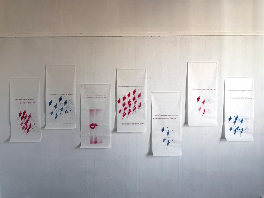 Cette semaine, j’ai ressorti des impressions en sérigraphie qui mêlaient des phrases issues de nos entretiens et des photos faites à Busan (la série de la jeune fille à la bouée).