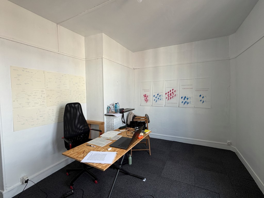 La décision de reprendre un atelier a été longue mais avec le ravalement, je passais mon temps dans des cafés et cela me revenait aussi cher. Surtout, avoir un atelier permet de mettre des choses au mur. Même si avec la photo et la vidéo, beaucoup du travail se fait sur écran, pouvoir disposer de murs pour avoir une image d’ensemble du projet est important.